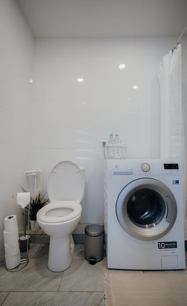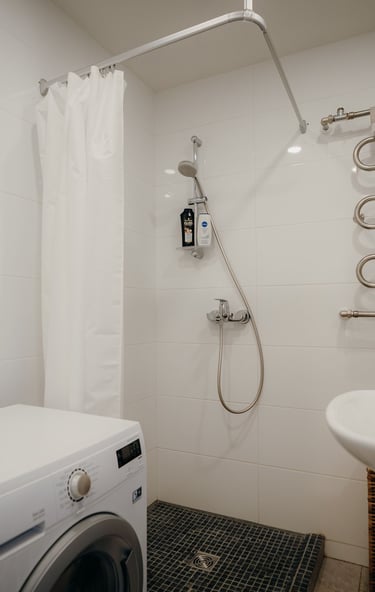 Enjoy the comfort of a fully equipped bathroom with a washer and dryer, shower cabin, and all the essentials for a pleasant stay.